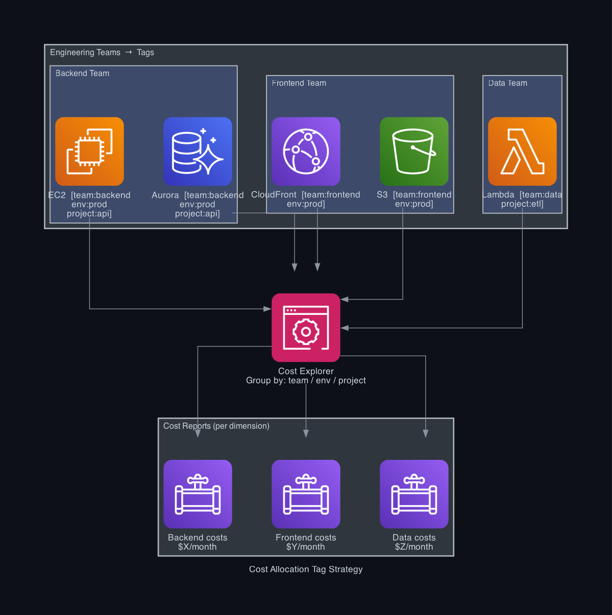 Without tags, Cost Explorer shows you one number: your total AWS bill. With tags, it shows you how much each team, environment, and project costs independently. Tags are the single highest-leverage change you can make to your billing visibility.