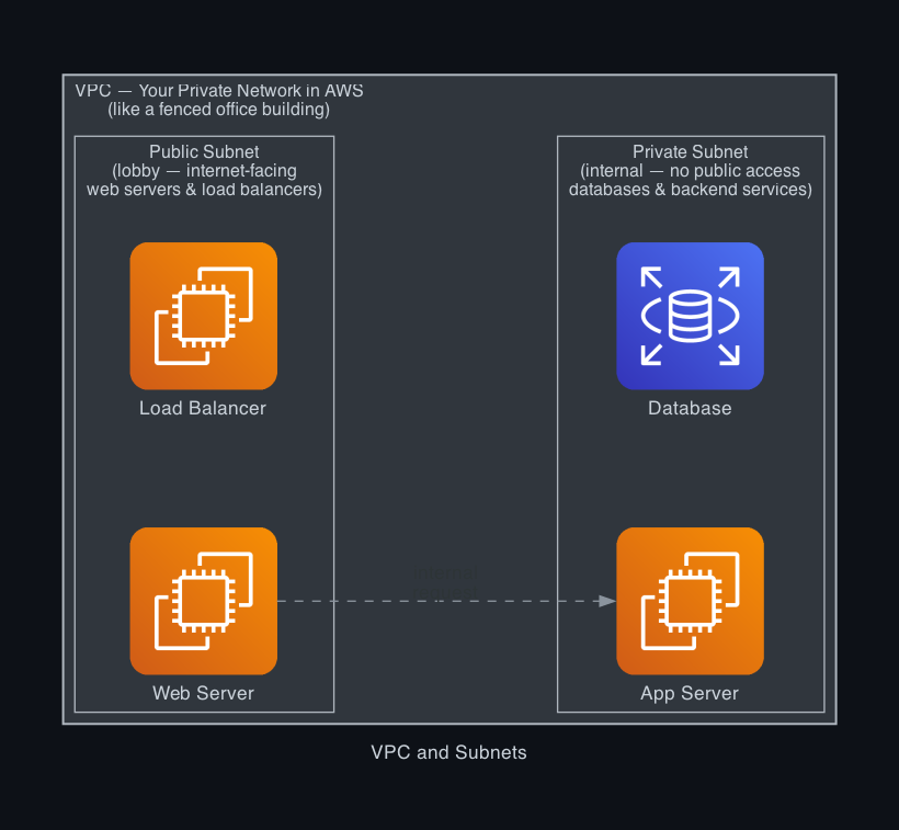 - Public Subnet — The lobby floor. Accessible from the outside world. You'd put your web servers and load balancers here, since they need to be reachable by users on the internet.
